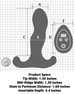 Measurements: Insertable Length: 4.4 Inches, Tip Width: 1.30 inches, Mid-Ridge Width: 1.30 inches, Stem to Perineum Distance: 1.68 inches